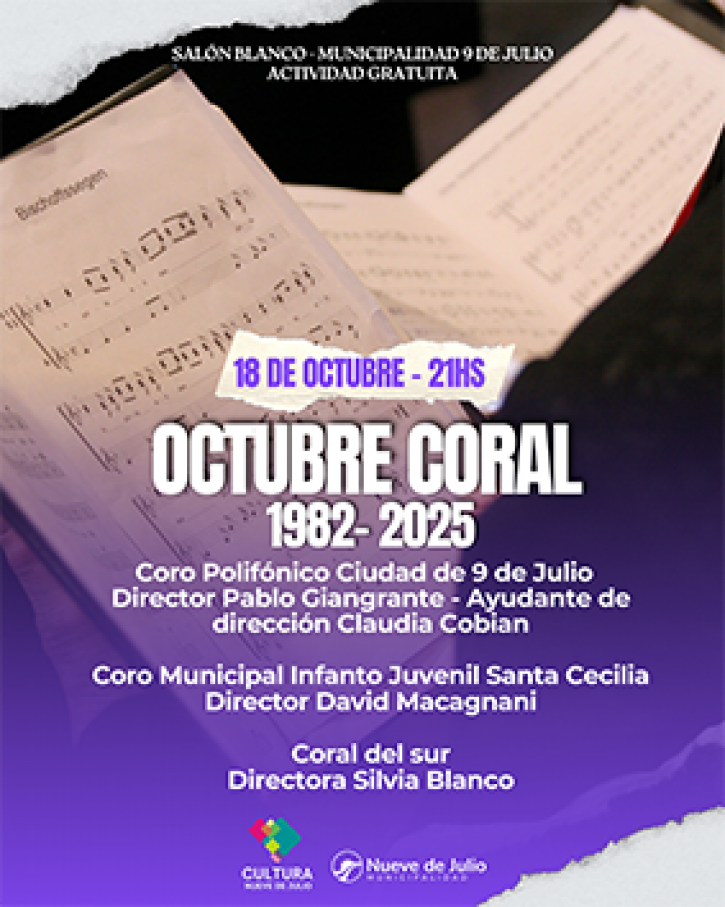 Este próximo sábado 18 de octubre, a las 21 hs., la Dirección General de Cultura y el Coro Polifónico 9 de Julio, invitan a la segunda fecha del ciclo Octubre Coral.