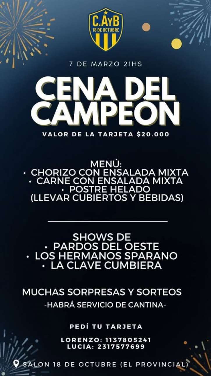 El Club y Biblioteca 18 de Octubre, de la localidad de El Provincial, informa que el venidero 7 de marzo se realizará la cena del Campeón.