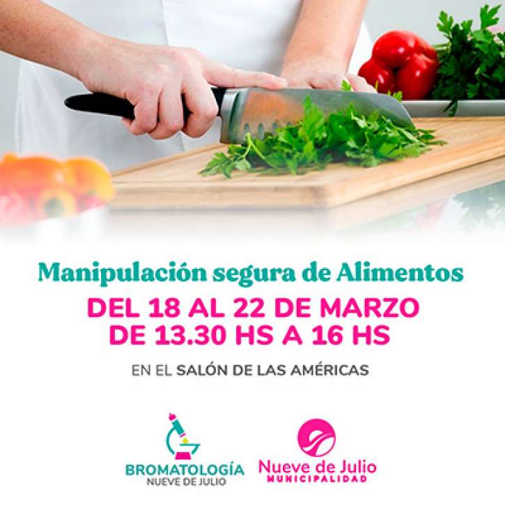 La Dirección General de Bromatología de la Municipalidad de Nueve de Julio informa que se encuentra abierta la inscripción para el nuevo curso de manipuladores de alimentos que se dictará entre los días 3 y 7 de abril en el Salón de las Américas del Palacio Municipal, en el horario de 13,30 a 16,30 horas.