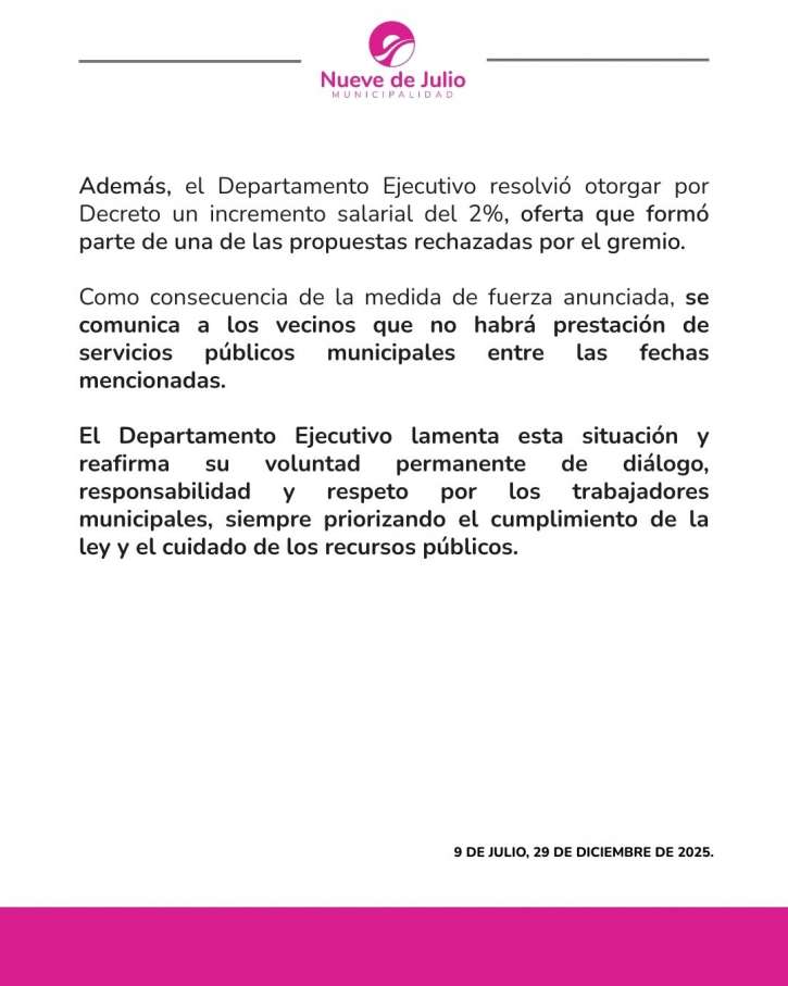 La Asociación de Trabajadores del Estado (ATE) parece no querer darle tregua al municipio y a todos los contribuyentes locales que pagan el salario de sus afiliados aún a sabiendas de que la comuna de Nueve de Julio se encuentra e emergencia económica.