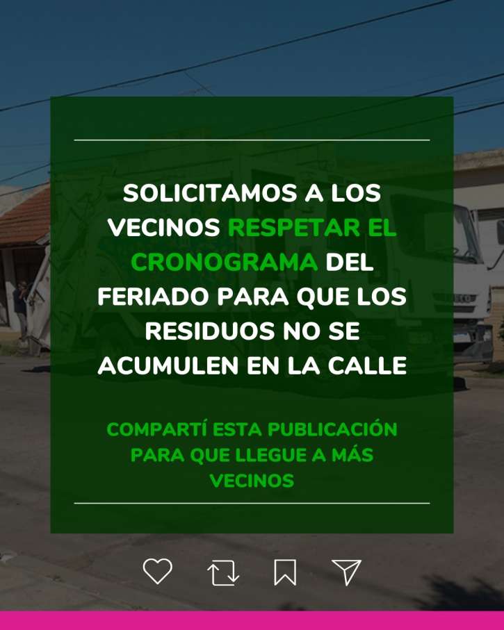 - Habrá recolección de residuos domiciliarios (bolsitas) el día lunes con normalidad, no así el día martes 17