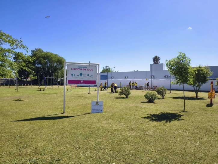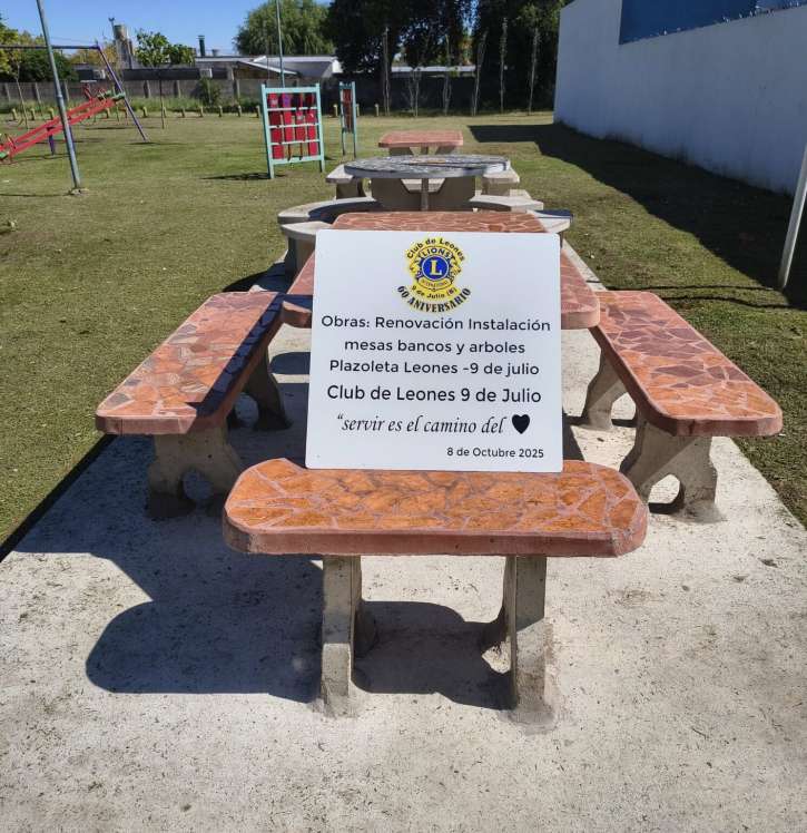 En el marco del 60° aniversario de su presencia en el distrito, el Club de Leones de Nueve de Julio presentó este martes la instalación de mesas y bancos en la plazoleta “Leones”, ubicada en Alsina y Chacabuco, con la participación de autoridades municipales, miembros de la institución y vecinos del barrio.